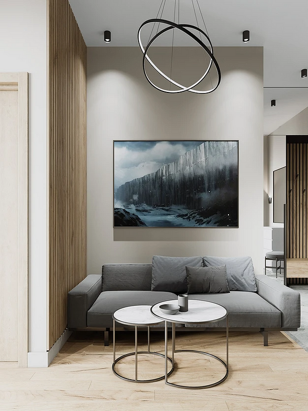 Для нейтральної гами використовуйте базові відтінки. Вони добре поєднуються між собою. Класичний варіант – сірий в парі з бежевим або коричневим. Це реалізується через натуральну фактуру дерева. Це може бути графітова софа в оточенні дерев’яних столиків. Або стелажів, шаф, стільців.